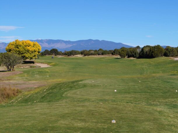 Hole 17 is a spectacular, long dogleg left, par 5 going uphill and right towards the Sangre de Cristo Mountains. The mountains, for a lot of the year, are snowcapped, which makes it a very scenic hole. There’s a large fairway bunker to the left off the tee box and a slope to the right. Anything to the right will gather back into the fairway and that’s the aiming point off the tee. On the second shot there are bunkers both left and right as you approach the green. The wisest course, if you can’t reach the green in two, is to lay up to it about a hundred yards having a good clear pitch into the green.